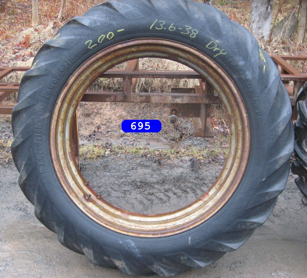12.4 x 38 titan tire like new, no rim $300.0013.6 x 38 Armstrong like new tire on drop center rim, stem has some rust, tire is about half loaded with fluid $300.0013.6 x 38 tire on drop center rim $200.0015 x 38 heavy duty rims with 8 bolt dishes or centers $500.00 for the set11.2 x 38 tires mounted on 8 bolt dish rims tires are dry meaning no calcium , 4 sets available $700.00 per set, not all sets shown in photosNice 11 x 38 drop center rim valve stem hole $150.0013.6 x 28 tires on power adjust rims tires are drySet of 13.6 x 28 tires on 6 loop rims $500.00 tires are not loaded but do show sign of weather checks12.4 x 28 tire on small 8 bolt pattern rim tire is loaded $150.0018.4 x 34 tire on double bevel rim tire is dry not loaded $200.0015 x 24 6 loop rim with 8 bolt center dish used but in excellent cond $200.00 per rim 8.3 x 20 like new Bridgestone tractor tread tire $100.00One set of 16.9 x 28 tires rims and dishes for $450.00. Tires are road worn and would be about perfect for a smaller pulling tractor ….down side is they do have some fluid in them but are not full…9.5 x 24 tire and like new rim fits farmall A dry $200.0014.9 x R 38 AS IS tire has a cut but is not thru the casing $50.0014.9 x 28 tire on power adjust rim ( Dry ) rim has some rust see photos $250.0016.9 x 24 tires on rims tires are dry