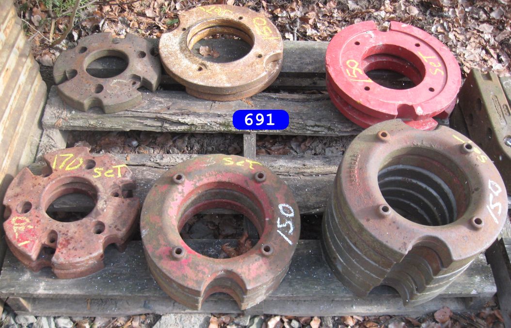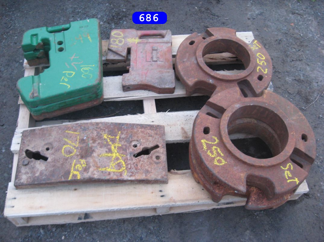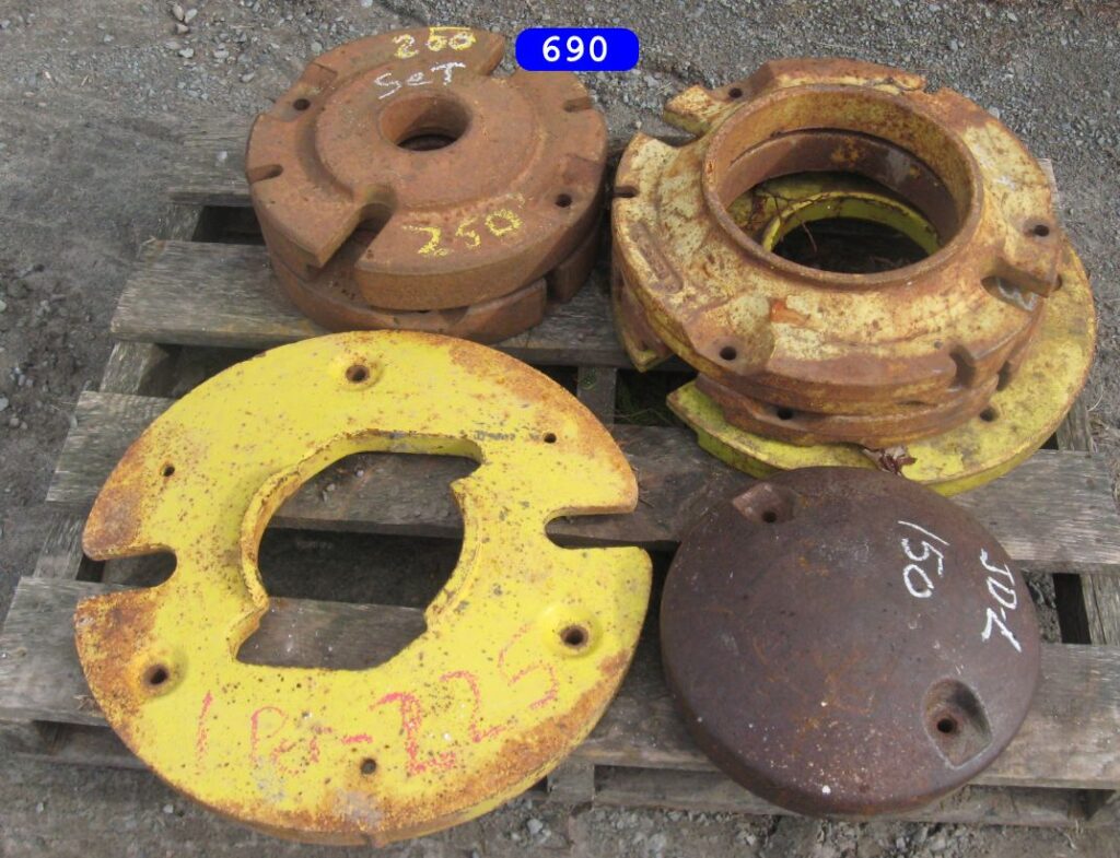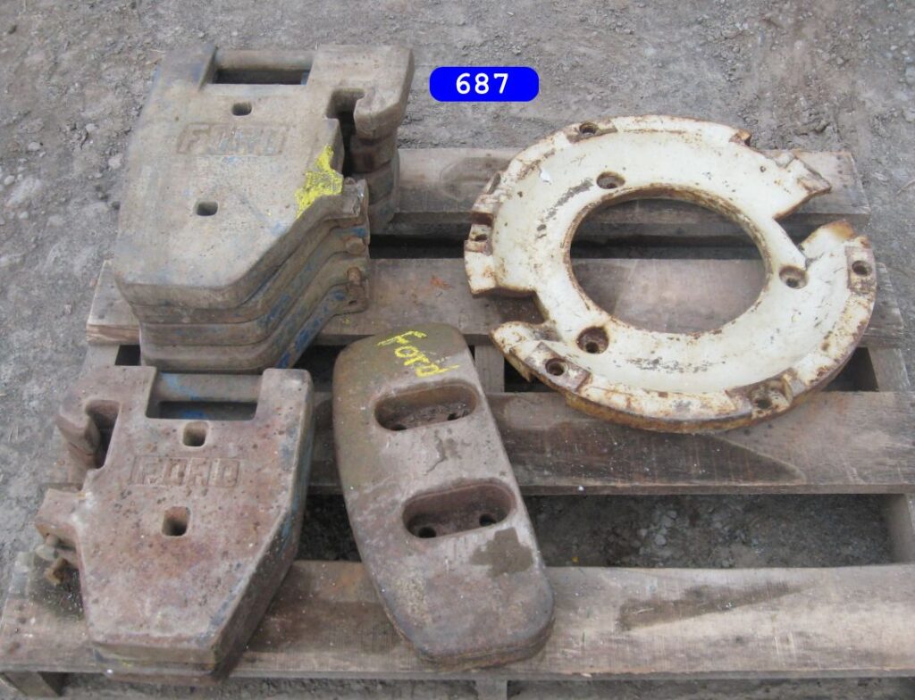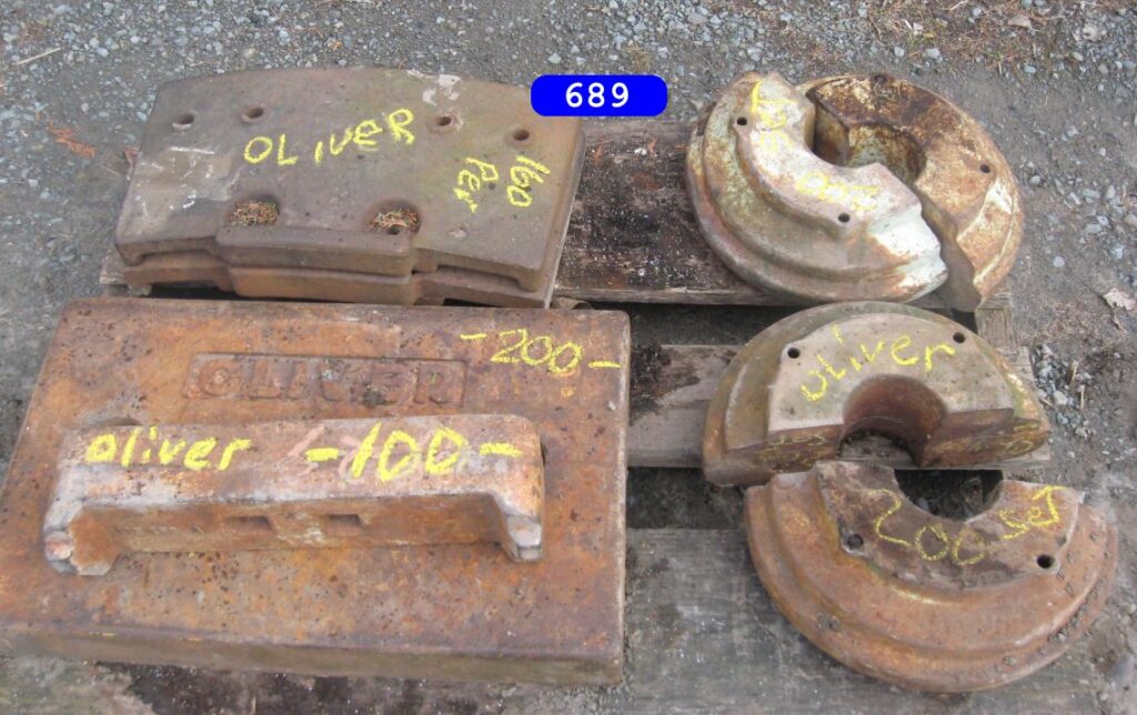 IH cone shaped wheel weights solids and splits $160.00 a set, JD wheel weights $250.00 a setJD slab starter weight $350.00 a set. and misc JD weightsPriced as marked Priced as marked Oliver weights priced as marked AC ,Case and IH wheel weights, and AC suitcase weights. priced as marked in photoFord weights $ CallJD and IH weights priced as markedFord 8N ,9N wheel weights $150.00 set John Deere wheel weight # D2628R….fits 2 cyl A,B,G etc have 3 …$250.00 a pair (2) …Oliver stack weight $100.00 casting # 105250 AJohn Deere wheel weights casting # R28520R $ 300.00 set John Deere front and rear wheel weights for John Deere M, MT, 320, 40, 420, 430, etc… $350.00 a set for casting # M1168T (front weights) JD rear weights casting # D2628R…. Fits JD A, B, G, etc… $250.00 setJohn Deere slab weight for JD 420, 430, etc. Casting # M1854T. $250.00More weights – Call!Miscellaneous Farmall weights. L shaped frame, casting # 371258-R1, fit Farmall 300, 350 utility. 2 Kubota weights