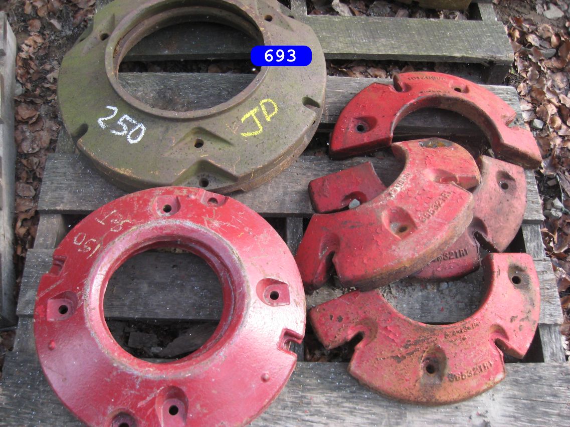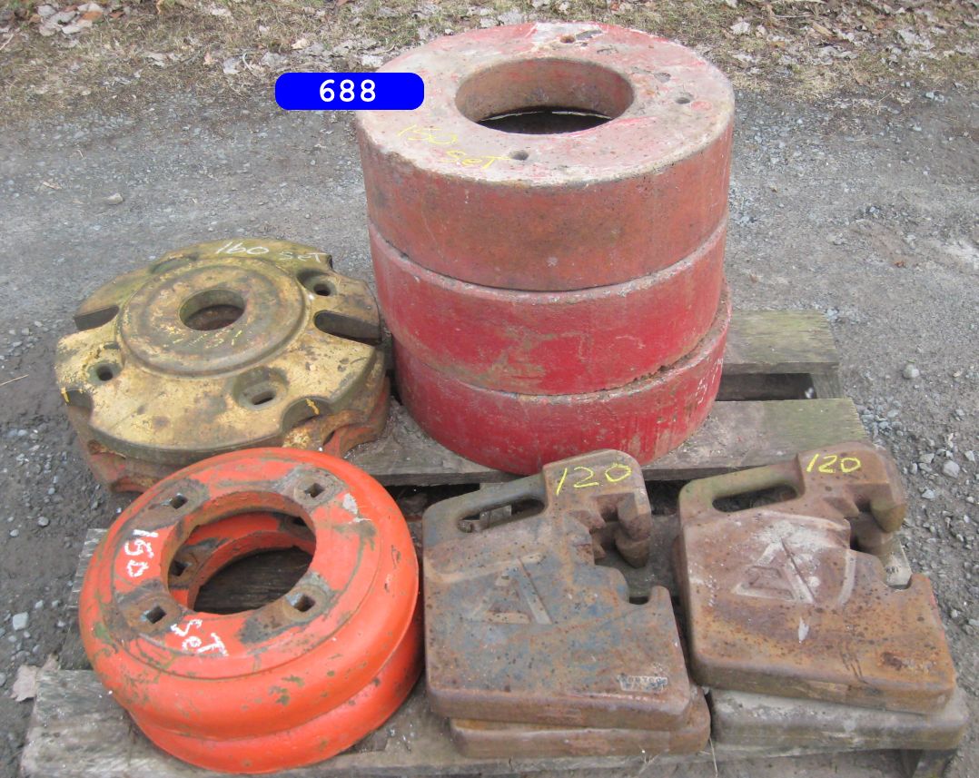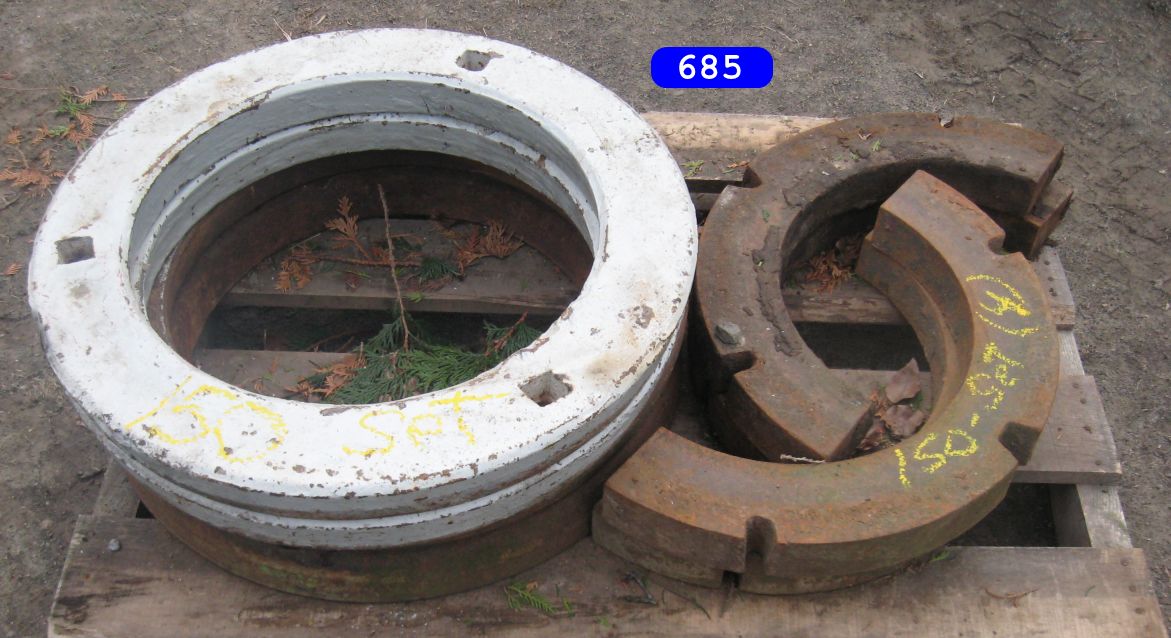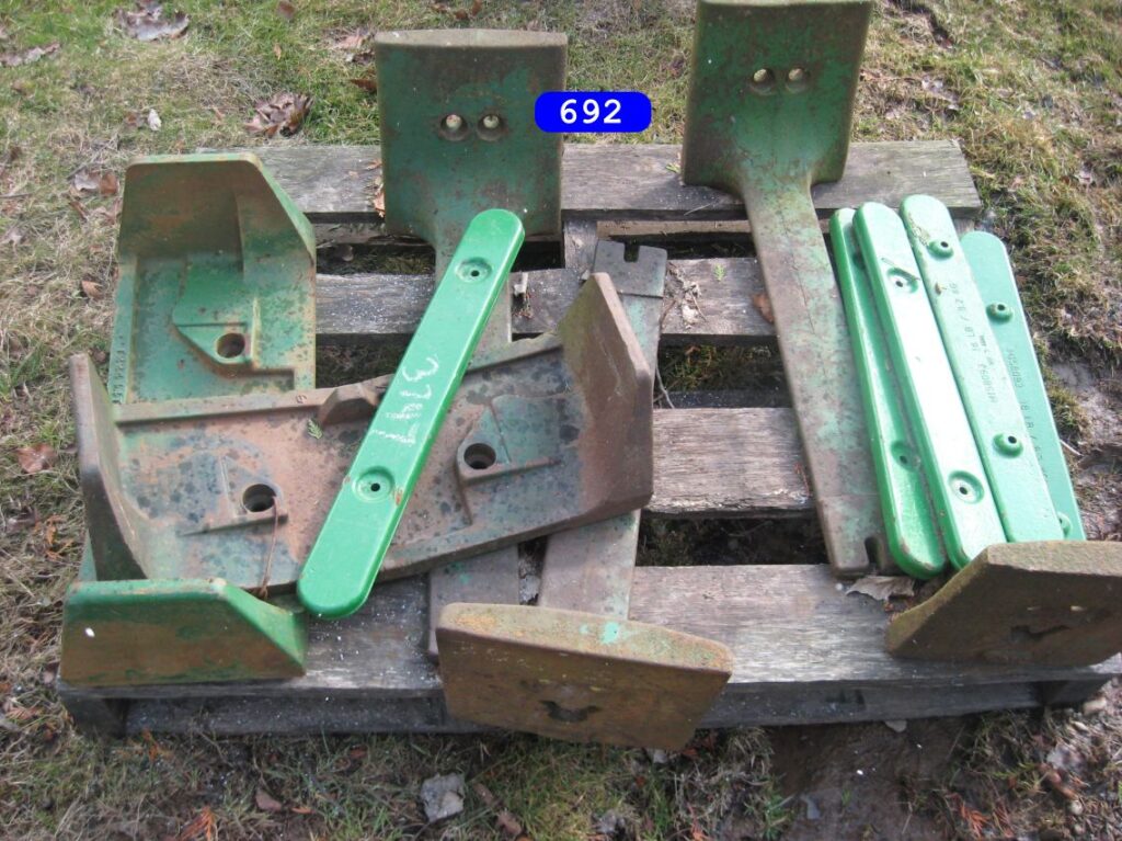 IH cone shaped wheel weights solids and splits $160.00 a set, JD wheel weights $250.00 a setJD slab starter weight $350.00 a set. and misc JD weightsPriced as marked Priced as marked Oliver weights priced as marked AC ,Case and IH wheel weights, and AC suitcase weights. priced as marked in photoFord weights $ CallJD and IH weights priced as markedFord 8N ,9N wheel weights $150.00 set John Deere wheel weight # D2628R….fits 2 cyl A,B,G etc have 3 …$250.00 a pair (2) …Oliver stack weight $100.00 casting # 105250 AJohn Deere wheel weights casting # R28520R $ 300.00 set John Deere front and rear wheel weights for John Deere M, MT, 320, 40, 420, 430, etc… $350.00 a set for casting # M1168T (front weights) JD rear weights casting # D2628R…. Fits JD A, B, G, etc… $250.00 setJohn Deere slab weight for JD 420, 430, etc. Casting # M1854T. $250.00More weights – Call!Miscellaneous Farmall weights. L shaped frame, casting # 371258-R1, fit Farmall 300, 350 utility. 2 Kubota weights